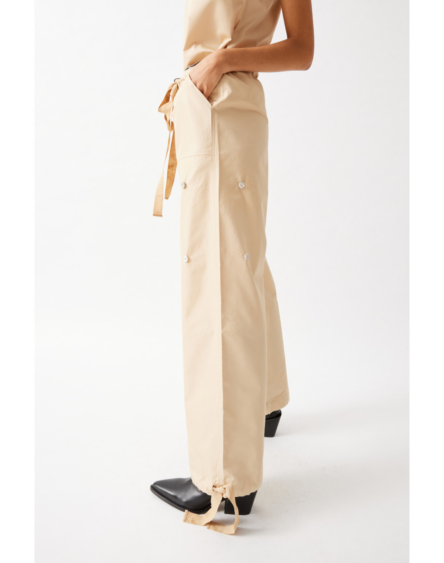 Don't forget to save your customization to be able to add to cartWorkwear-cut trouser with patch pockets on the front and 4 buttons on the external side of each leg to attach removable pockets, for a cargo-like look. Drawstring around the waist for adjustable width allows wearing it both high or low waist. Drawstring at the hem of both legs for a sportier or more classic look.