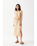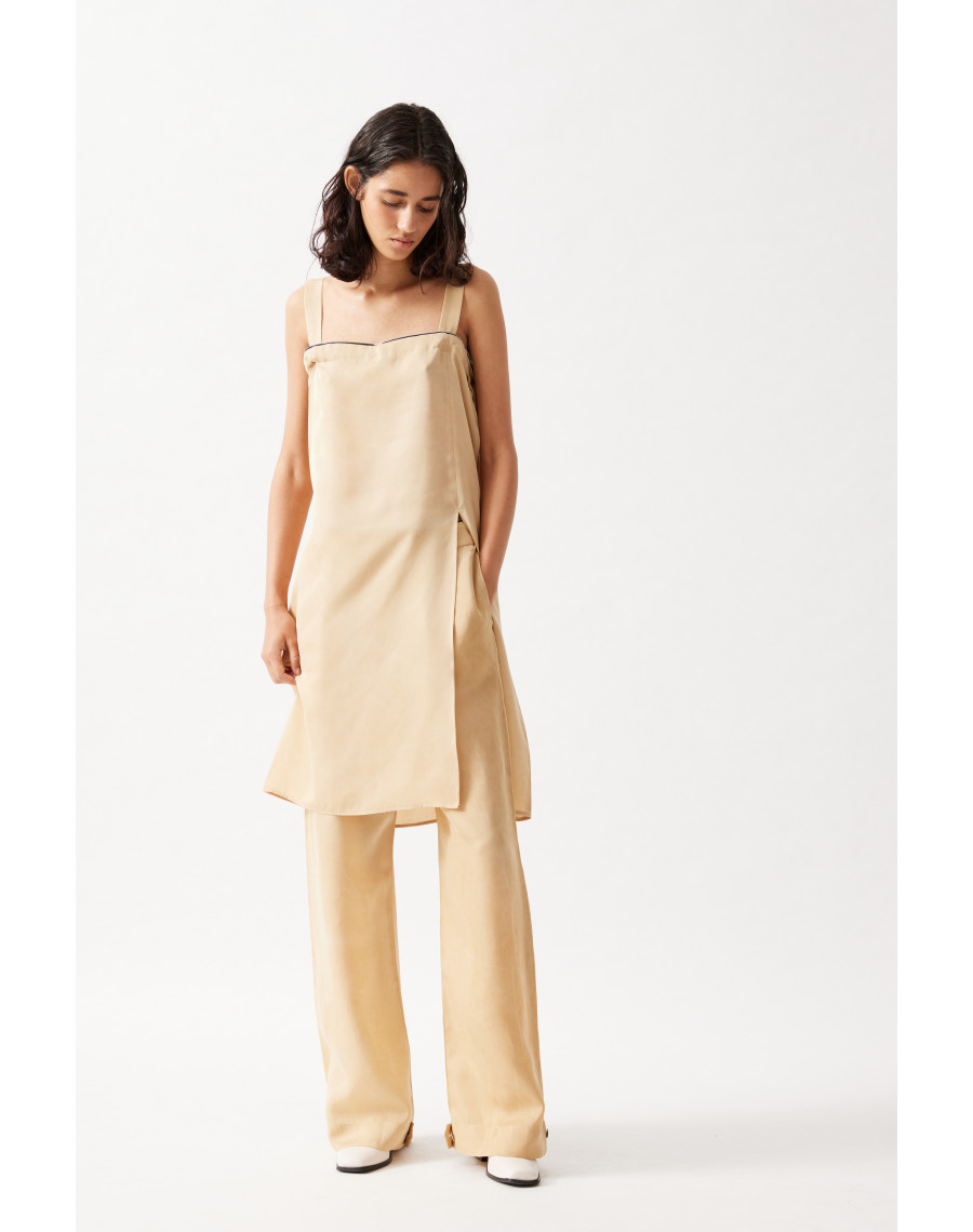 Flared midi-skirt with slit on the front-left side. The drawstring around the waist gives freedom to adjust its width to wear it with both high or low waist. The skirt comes with two straps that can be attached at the buttons inside the belt to wear it either as a dress or a top.