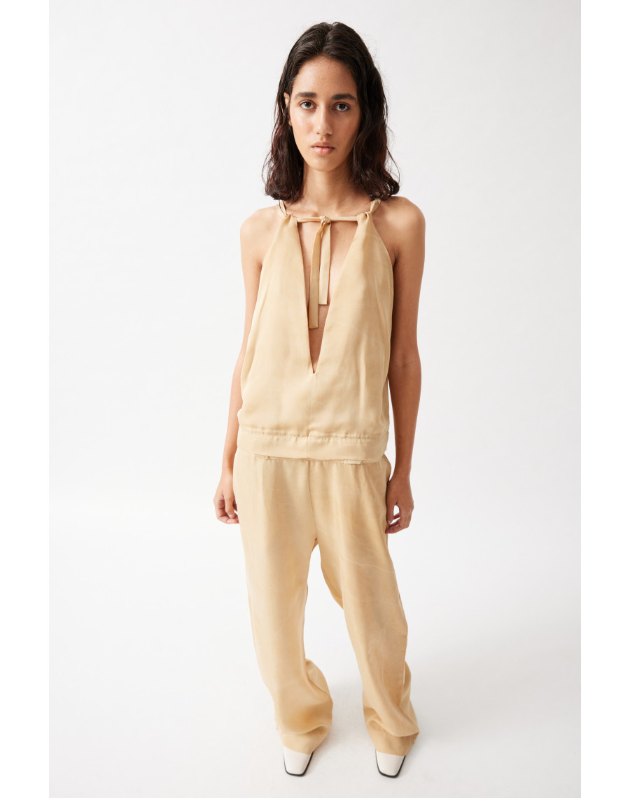 The Multiple Necklines Top: This top is created by four triangles, attached only to the bottom-end, that go up both on the front and on the back. Each of the four parts have a drawstring at the top, where you can attach either two separate straps on each side, or a single longer strap that connects them all. These solutions allow creating numerous necklines, even adding a strap around the waist.