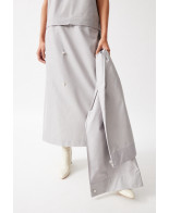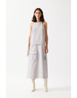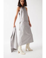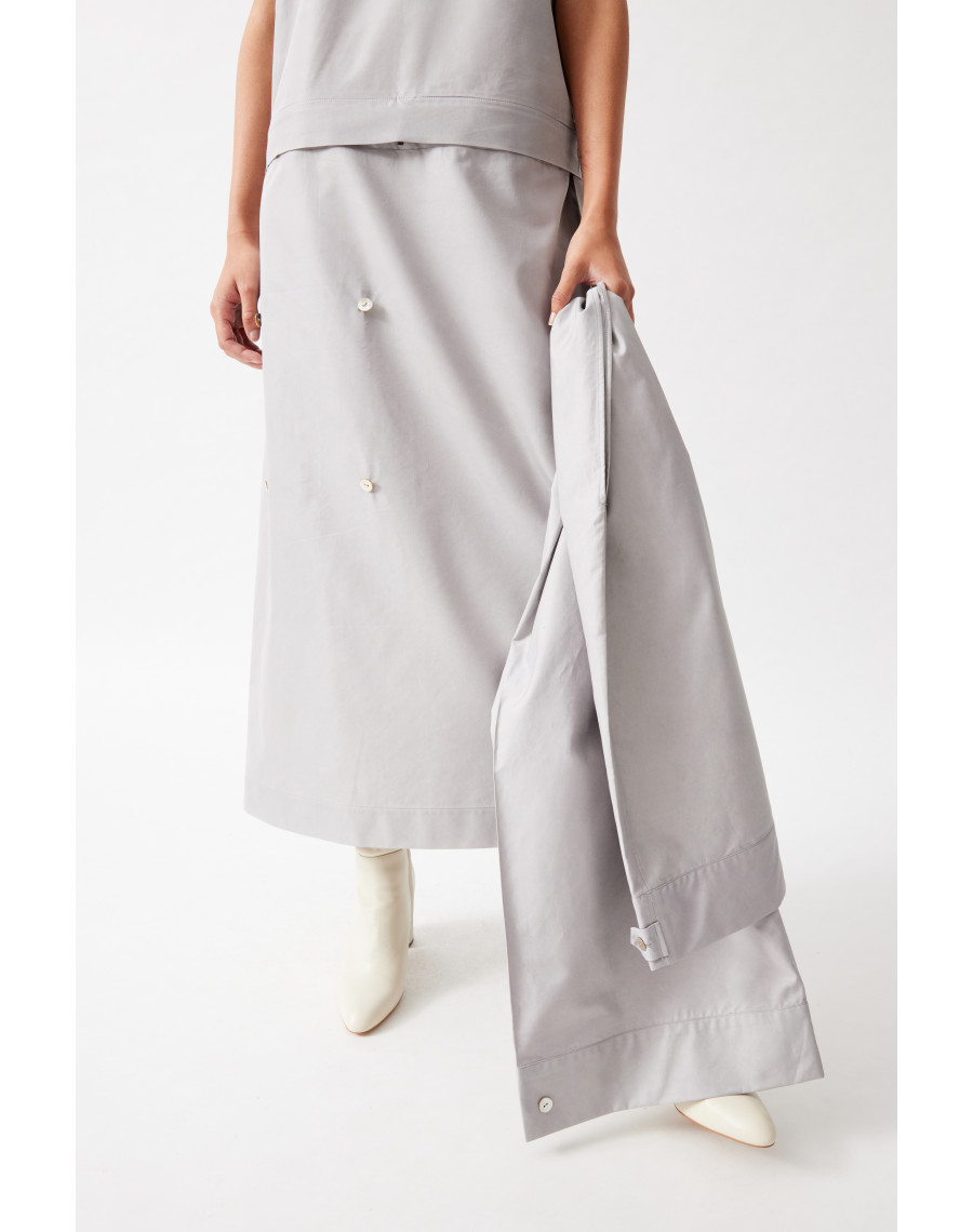 Midi dress created by zipping the two following modules together. Remember that you can zip and unzip the modules whenever you want to wear them separately! The Halter-Neck top w/ Shrug. Very low-cut top, both front and back, is completed by a shrug that allows the duo to adapt to different situations. Wear it with wide open or closed sleeves thanks to frogs and buttons at the bottom of the sleeves. The loose fit top has darts on the breast for a better feminine fit. The shoulder warmer itself can be worn in multiple ways: as a shawl with a knot on the side or worn dropped over the shoulders. The Cargo Midi skirt w/ a Removable Pocket. A-line minimal midi skirt with 4 buttons on the front-right side to host one removable pocket, for a sportier twist. This skirt features a drawstring around the waist to give you freedom to adjust its width and to wear it at both with high or low waist and - why not? - even as a dress. Guess what? There are multiple ways to wear this piece. Check them out browsing the different color options of the same article. FABRIC:This fabric is made using TENCEL Lyocell, the biodegradable fiber derived from sustainable wood sources. Composition: 67%CO - 33% CLY. Supplier: Tessuti di Sondrio, Italy COLOR:This color is made using natural dyeing with a cold-dyeing process that uses only organic raw materials, little amount of water, no energy. Each piece is individually dyed. The slight change of shade and any small imperfection of the color are signs of its uniqueness. Supplier: Phillacolor, Italy. FIT:Loose and adjustable fit. The model is 177cm and is wearing a size S. Check the Size Guide to select your right size.
