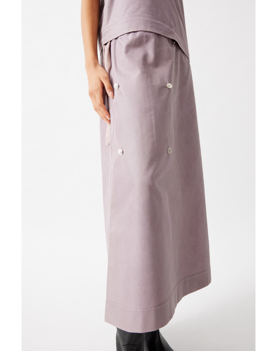 The Cargo Midi skirt w/ a Removable Pocket: A-line minimal midi skirt with 4 buttons on the front-right side to host one removable pocket, for a sportier twist. This skirt features a drawstring around the waist to give you freedom to adjust its width and to wear it at both with high or low waist and - why not? - even as a dress.