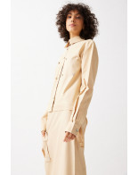 The Cargo Shirt w/ Removable Pockets: Inspired by the classical white shirt with minimal design, this version features two sets of mother-of-pearl buttons on the front, left and right, to host two removable pockets. Thanks to such buttons, the shirt can be wrap-top closed giving the garment a different stylish and sexy twist.