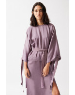 The Kimono Top: Top featuring wide sleeves with drawstring at each bottom: wear them wide open or closed, to create a balloon effect. Removable waist-belt to tighten the top and mark the waistline. A play of falling laces gives movement to this elegant top.