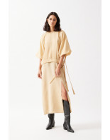 The Vent Midi Skirt: Flared midi-skirt with slit on the front-left side. The drawstring around the waist gives freedom to adjust its width to wear it with both high or low waist. The skirt comes with two straps that can be attached at the buttons inside the belt to wear it either as a dress or a top.