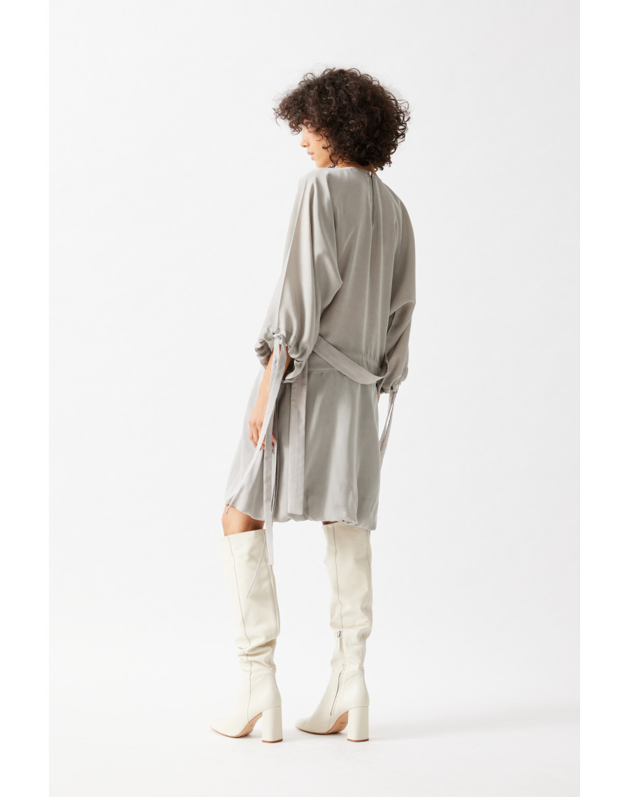 The Kimono Top: Top featuring wide sleeves with drawstring at each bottom: wear them wide open or closed, to create a balloon effect. Removable waist-belt to tighten the top and mark the waistline. A play of falling laces gives movement to this elegant top.