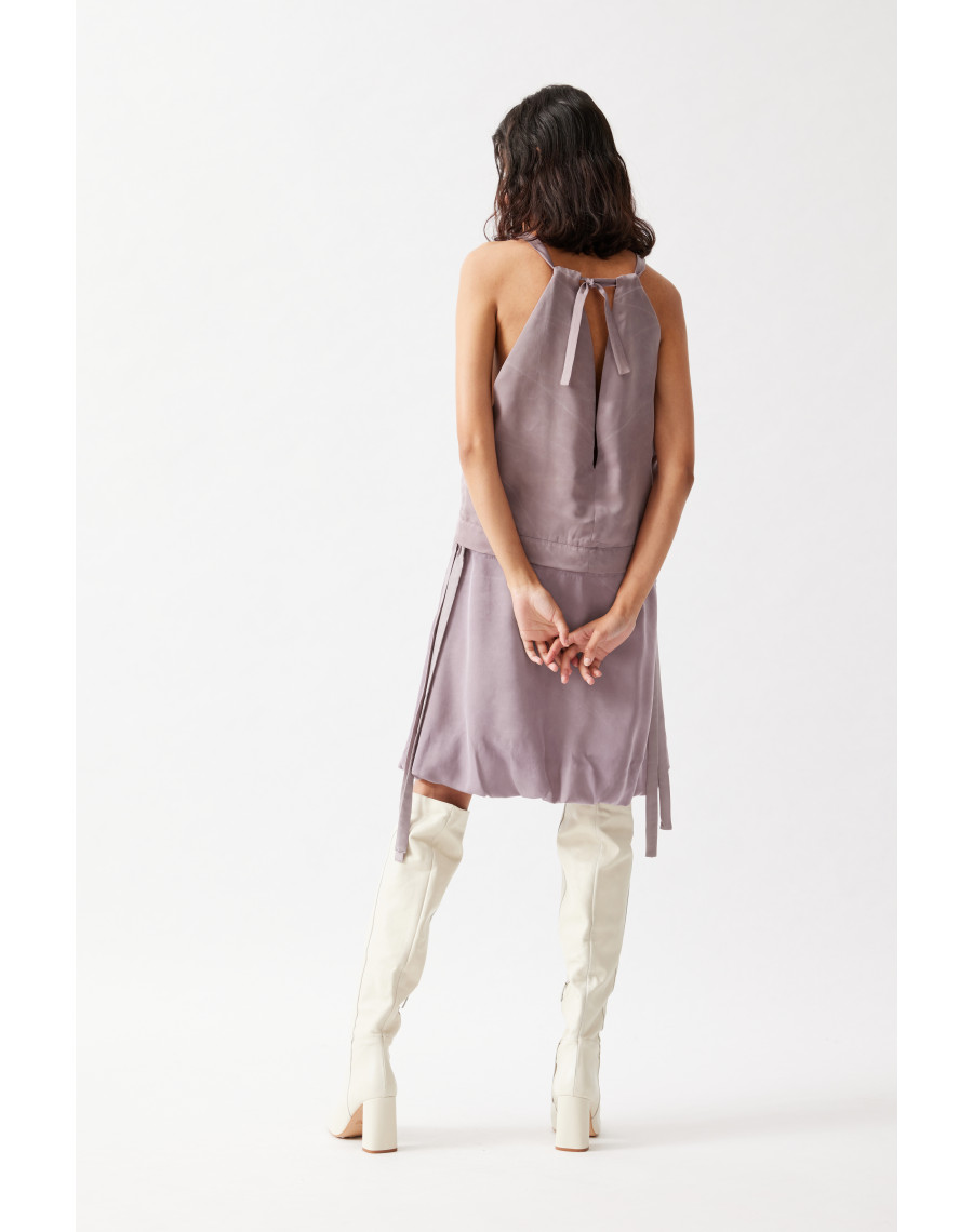 The Ballon Mini Skirt: This skirt plays with volumes created thanks to its balloon-shape. It features pockets on the side for a more casual look and feel. The drawstring around the waist provides adjustable width, allowing to wear it with both high and low waist, enhancing or reducing its balloon effect.