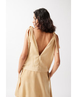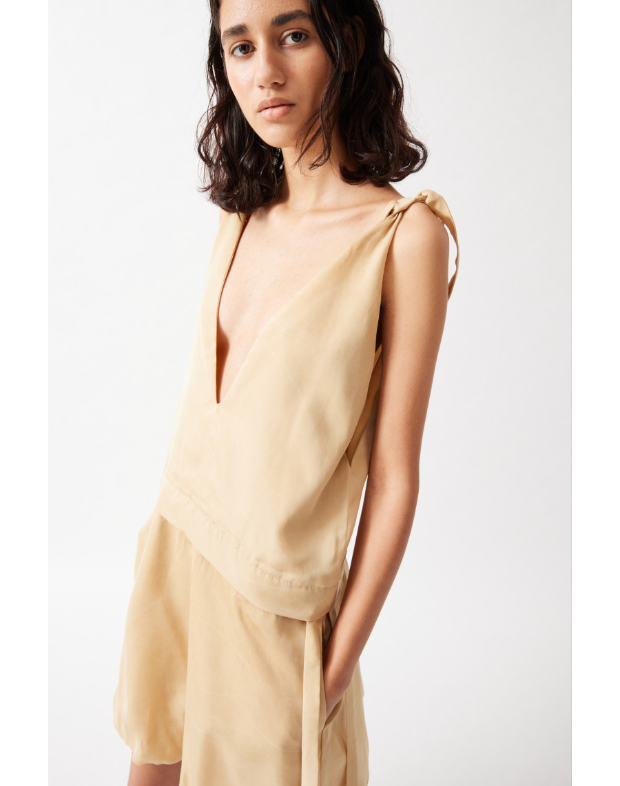 The Multiple Necklines Top: This top is created by four triangles, attached only to the bottom-end, that go up both on the front and on the back. Each of the four parts have a drawstring at the top, where you can attach either two separate straps on each side, or a single longer strap that connects them all. These solutions allow creating numerous necklines, even adding a strap around the waist.