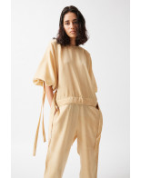 The Kimono Top: Top featuring wide sleeves with drawstring at each bottom: wear them wide open or closed, to create a balloon effect. Removable waist-belt to tighten the top and mark the waistline. A play of falling laces gives movement to this elegant top.