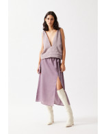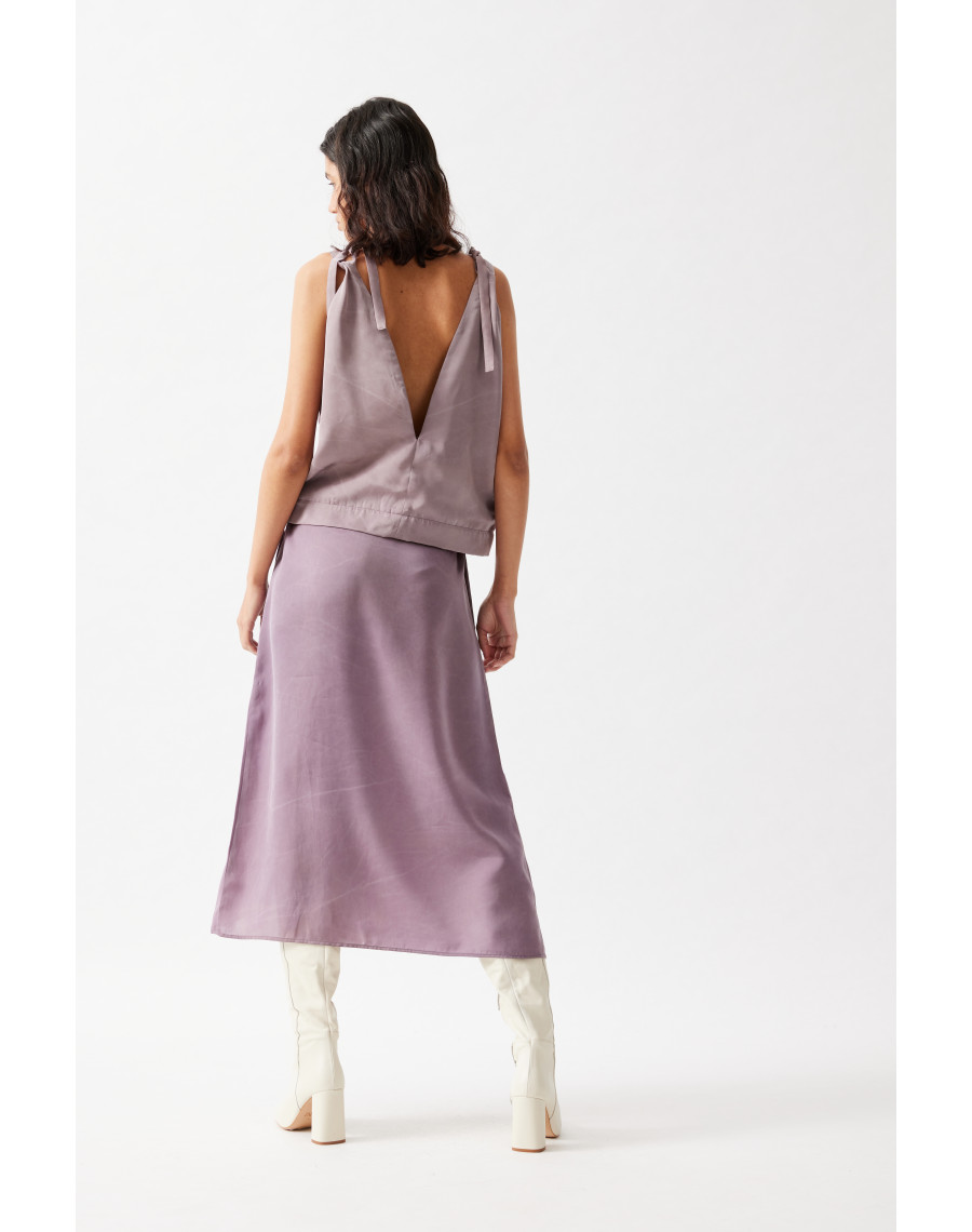 This top is created by four triangles, attached only to the bottom-end, that go up both on the front and on the back. Each of the four parts have a drawstring at the top, where you can attach either two separate straps on each side, or a single longer strap that connects them all. These solutions allow creating numerous necklines, even adding a strap around the waist.